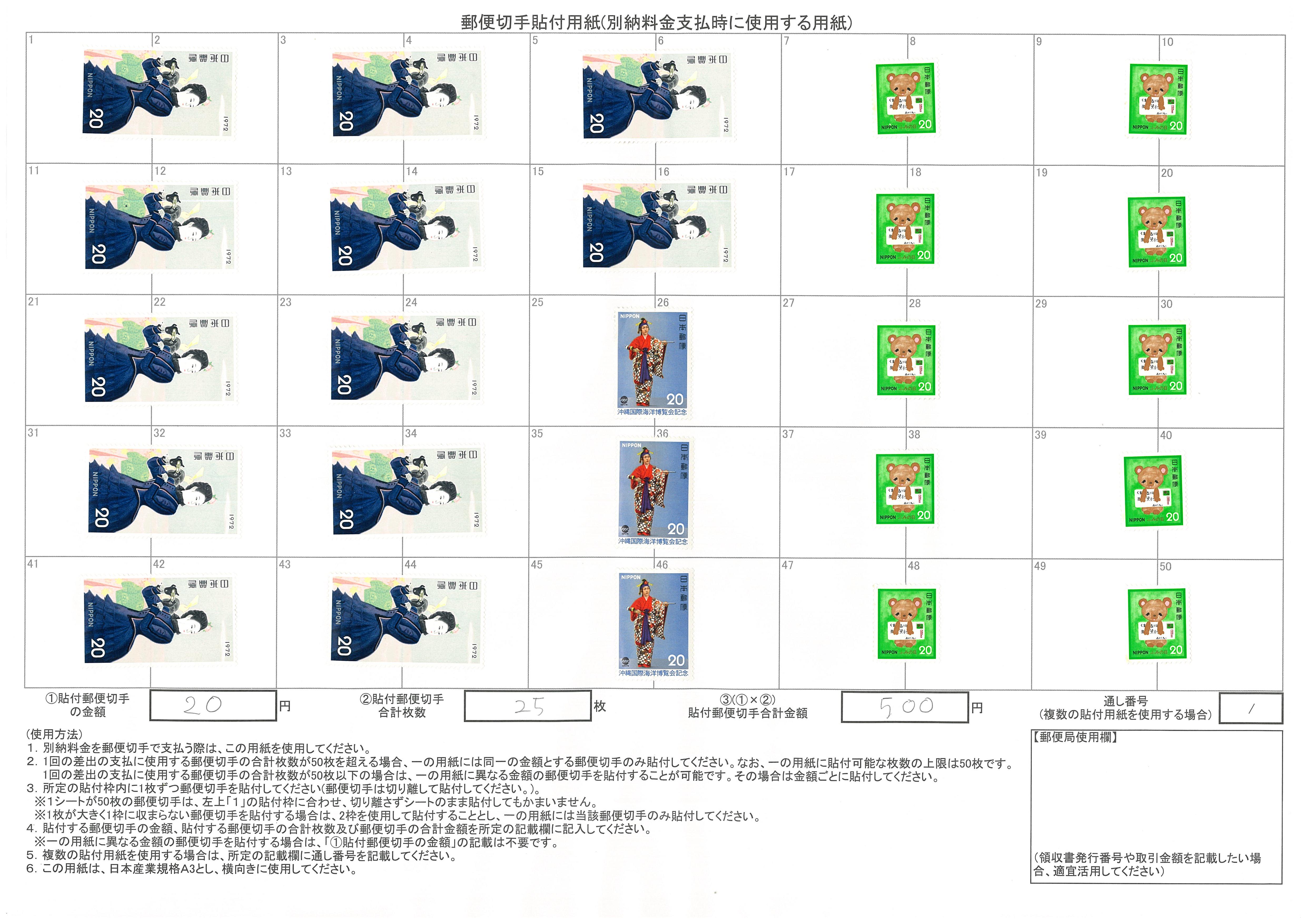 (注)50枚貼りは日本郵便所定の用紙に貼り付ける際、枠内に1枚ずつ切手を貼ってください。